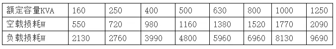 干式變壓器技術參數有:①頻率50Hz,②空載電琉,要求少于4%,③低壓耐壓強度:2KV/min無擊穿,④絕緣電阻低壓側不少于2MΩ,⑤繞組連接方式:/Y/yn0,與D/yn0 ,⑥線圈允許溫升100K,⑦散熱方式:自然風冷或溫控風冷,⑧噪聲系數小于30dB。各種容量干式變壓器(SCB型)損耗參數如表1所示。