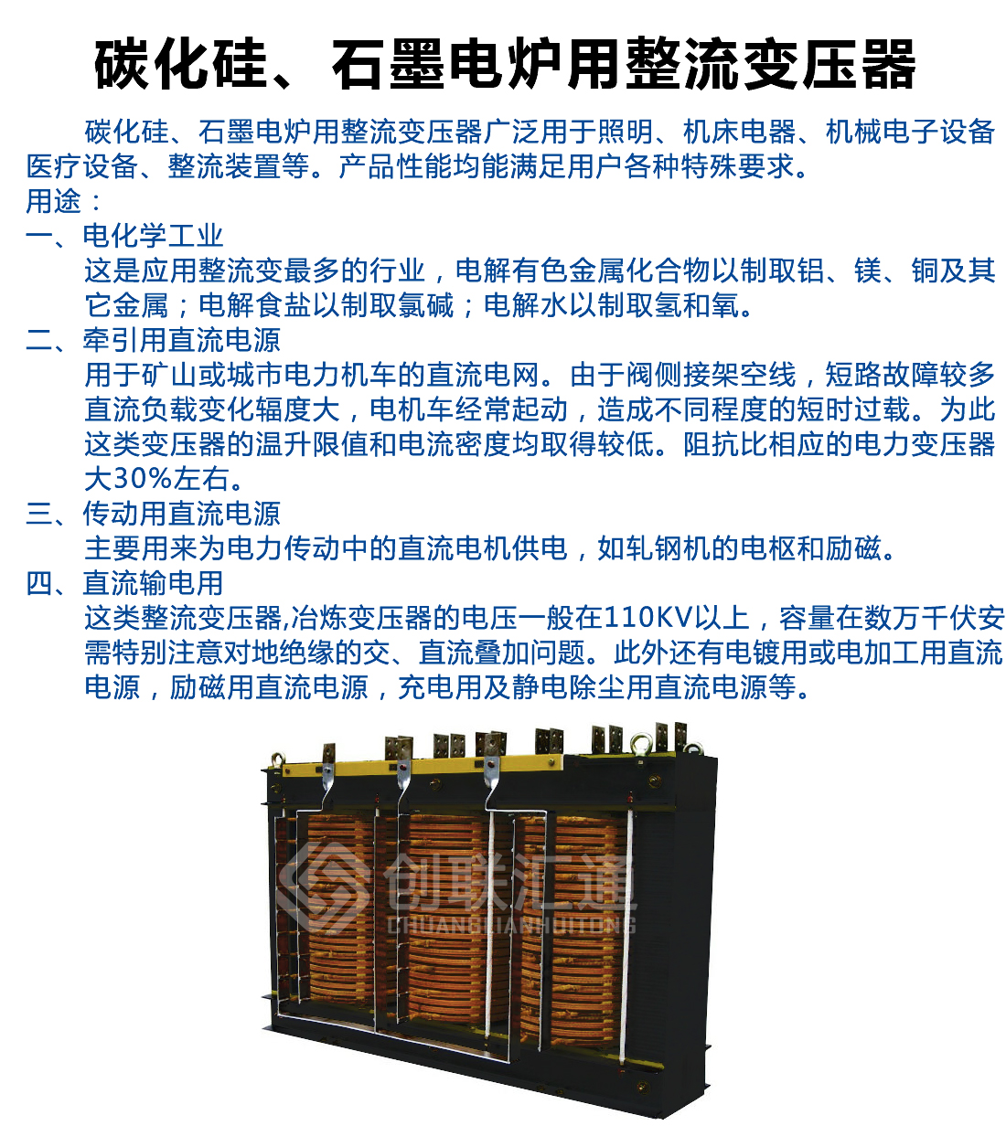 碳化硅、石墨電爐用整流變壓器廣泛用于照明、機床電器、機械電子設備、醫(yī)療設備、整流裝置等。產(chǎn)品性能均能滿足用戶各種特殊要求。